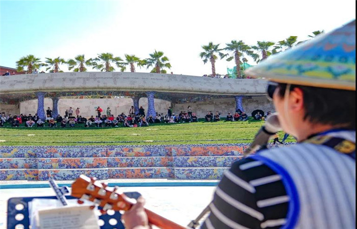 星空劇場(chǎng)、紅磚建筑墻下、園內(nèi)廣場(chǎng)全天路演,席地坐草地上,休憩間有樂(lè)器與人聲產(chǎn)生共鳴,儼然一個(gè)小型草地音樂(lè)會(huì)。