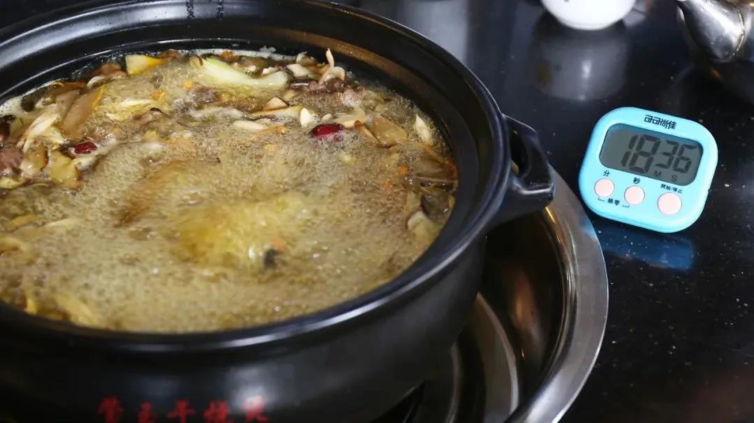 鍋底湯沸騰以后加入菌子,一般菌火鍋煮上25-30分鐘就能揭蓋,云南大多數(shù)餐廳會用計(jì)時器計(jì)時。