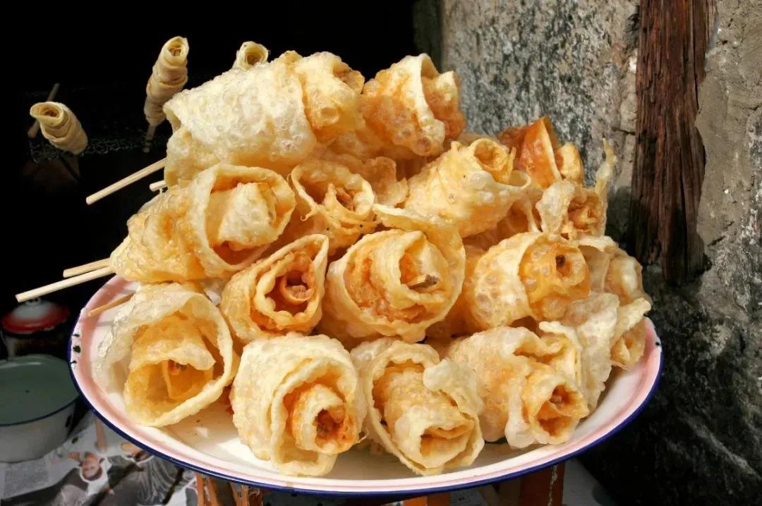 云南還有一種夾沙乳扇卷,就是將云南特有的玫瑰豆沙醬涂抹在乳扇上,然后卷起來油炸了吃,酥脆香甜,奶香異常。