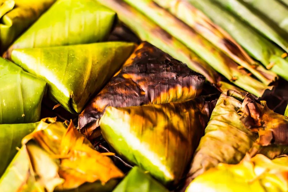 包燒,是傣族一種特殊的烹制食品的方法,不用傳統(tǒng)的鍋具,而是以天然綠葉(芭蕉葉或者木冬葉)為烹飪工具,把食物用葉子包裹,以火塘為熱源,將食物燒熟。