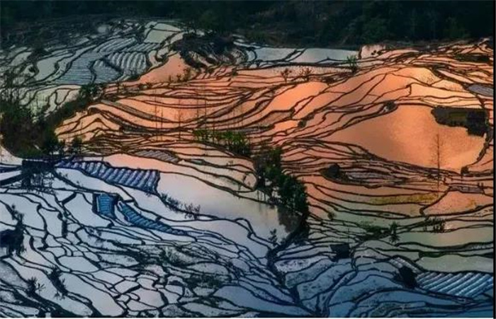梯田在秋收后會灌滿水一直到次年插秧,這個(gè)時(shí)候看梯田層次感很強(qiáng),在陽光的照射下波光粼粼,我們在網(wǎng)上看到的很多梯田照片都是在這段時(shí)間里拍攝的。