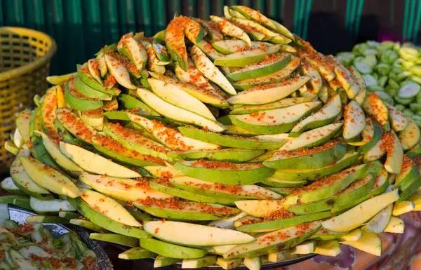 青芒果還有另一種吃法呢!將芒果削成薄片,浸在醬油里,拌上切細(xì)的新鮮小米辣、蕪荽,多了點(diǎn)甜味,少了些酸味脆味,也少了口感的刺激味,但是別有一番風(fēng)味。