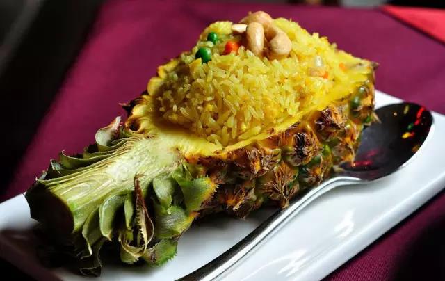 菠蘿還可以當(dāng)飯吃。把帶皮的菠蘿中間挖空了,放入紫米和水,蒸熟了就是甜又香的菠蘿飯了。菠蘿飯取了八寶飯的甜味,卻沒(méi)有油膩味,吃起來(lái)非常爽口。外地人最喜吃這種獨(dú)具特色的飯了。圖片