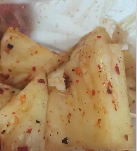 涼開(kāi)水溶解適量的鹽,不要太咸。把菠蘿切片,放入水中浸泡5到10分鐘即可。放入辣椒、香菜,即可成為云南可口的涼菜或零食。