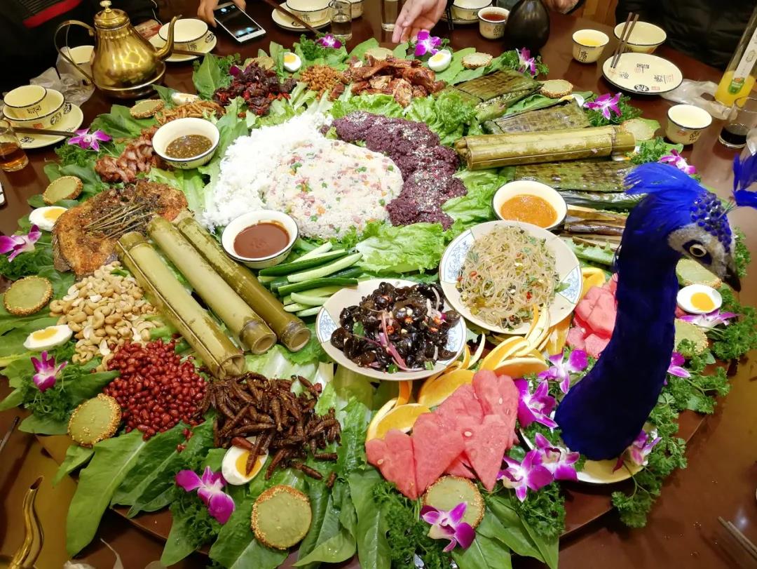 賞玩美景,再來一桌“孔雀宴”。這桌由15道菜組成的地道云南風味美食,食材均取自當?shù)氐脑鷳B(tài)食材,香茅草烤土豬排、傣味燒肉...