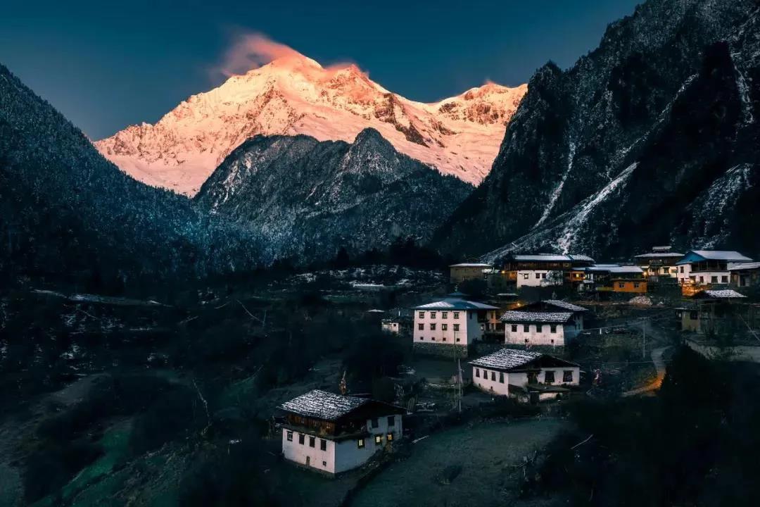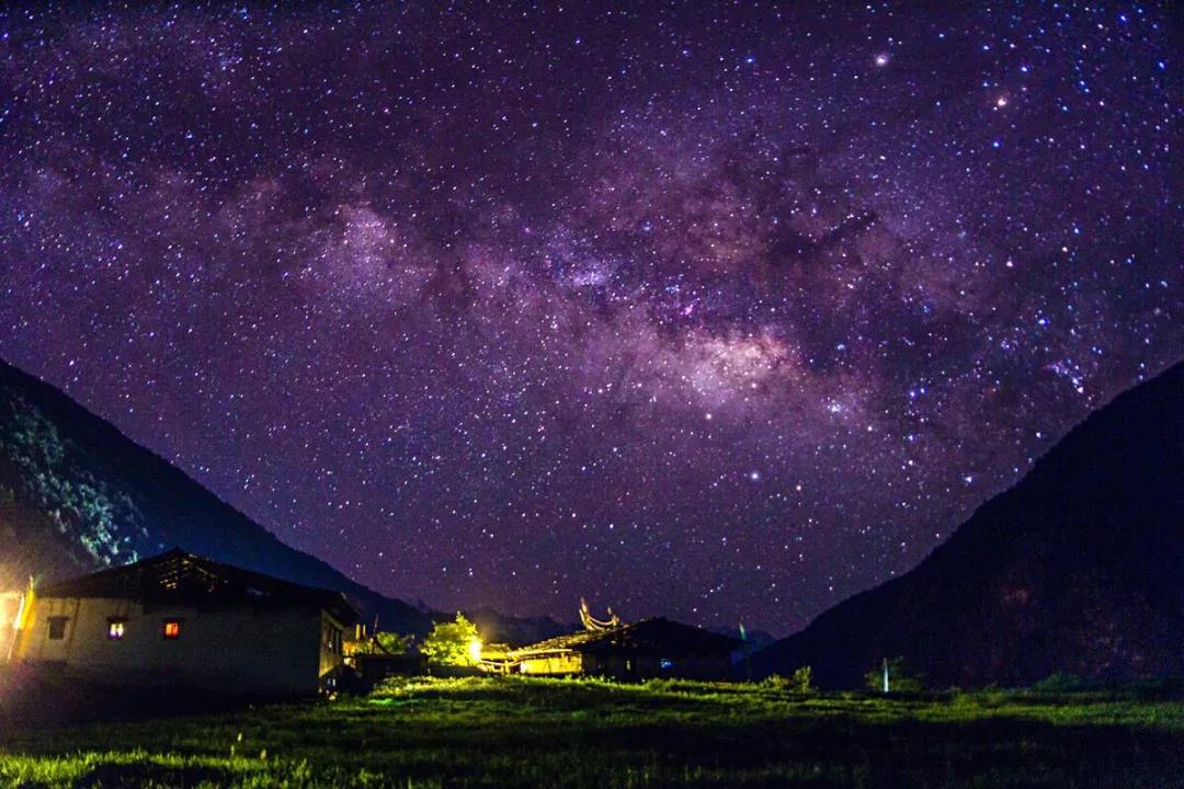 夜晚,滿天繁星閃耀,將黑夜的浪漫展現(xiàn)的淋漓盡致。漫天的繁星開始漸漸的展露光芒,照耀著雪山、村莊。