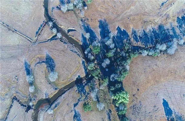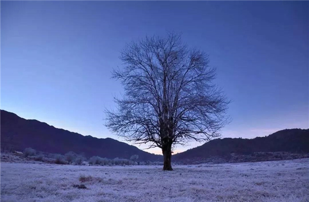 清晨7點,氣溫0℃,整個壩子都被籠罩在一層朦朧的白雪下,草地上遍布白霜,造型各異的樹木被潔白的霜包裹著。