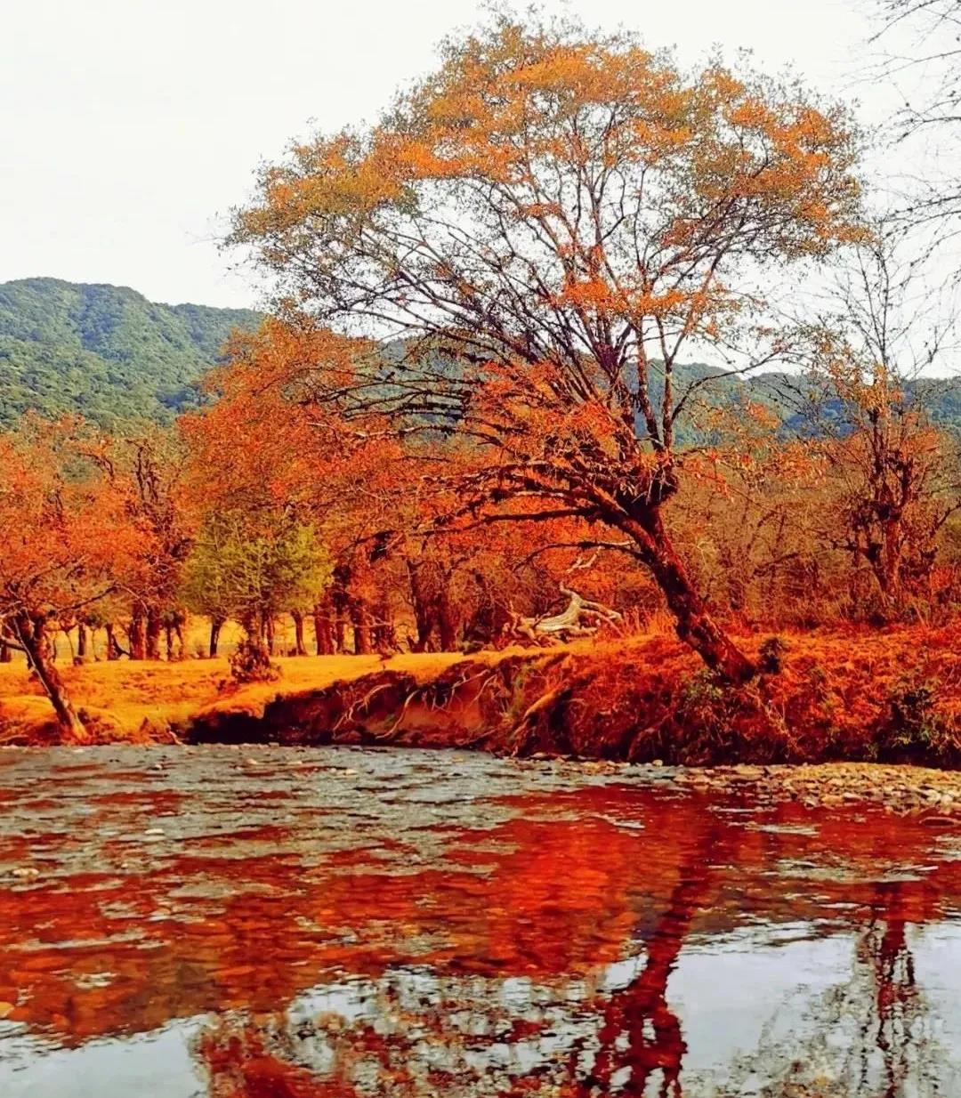 秋天不似夏天干燥熾熱,也不似冬天凜冽寒冷,但岸邊那抹熱烈的橙紅卻似燒暖了整汪池水。