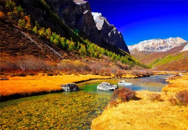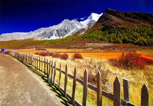 稻城亞丁最美的時候,此時的風景紅黃相間,紅草地與萬畝金色楊樹林讓稻城五彩斑斕,雪山在藍天白云的襯托下,更顯夢幻,猶如童話世界一般。