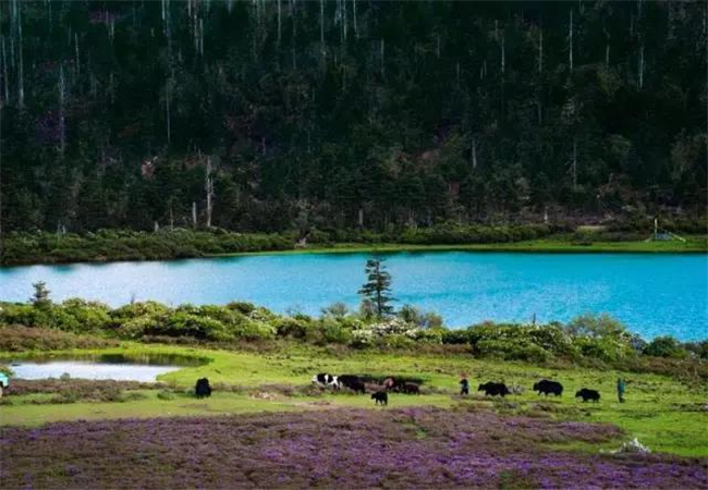 碧沽天池除了湖水、安靜的牛群羊群,還有動(dòng)人的杜鵑花,重要的是這里的杜鵑花顏色不同,其中黃、白、紅色居多,花開時(shí)節(jié)群芳競(jìng)相吐艷,湖畔就成了湖水所圍系的美麗花環(huán)。