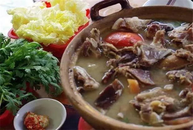 臘排骨火鍋選用的是經(jīng)土法腌制的排骨,用砂鍋燉煮,食用時通常配備時鮮蔬菜:薄荷、韭菜根、西紅柿、芹菜、洋芋、野生菌、茨菇、板藍根、粉條等等。以當(dāng)?shù)靥赜械恼核{(diào)味,鮮美濃郁,肉香汁鮮,卻愈煮愈香。再佐以當(dāng)?shù)孛拙?,其滋味妙不可言?