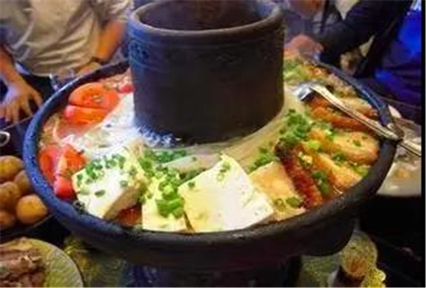 主要原料有鍋奔、洋芋、熟豬肚、豆腐、水發(fā)粉等,配以熟火腿、木耳、琵琶肉,再撒少許麻油,香氣四溢、馥郁芬芬。食之御寒暖身,營養(yǎng)滋補。吃此火鍋,是好用銅制或土陶容器,味道更美。