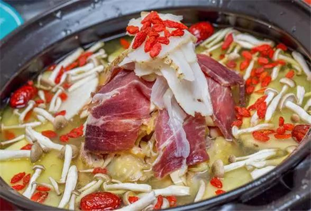 鮮香美味,肥而不膩,滋補怡神,天麻火腿雞火鍋是以昭通天麻、文山三七、宣威老火腿為主,配以西洋參、大棗、枸杞等二十余種名貴藥材、精心烹制而成。