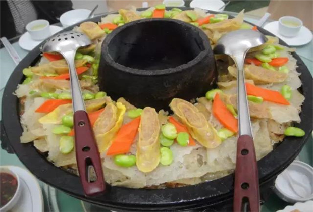 騰沖鍋子的用料及制作系以青菜、芋頭、淮山、紅苕、黃筍等,用鮮肉骨頭湯煮熟為底料,上鋪一層泡皮(泡皮的制作很獨特,它是用洗凈的鮮豬皮曬干后,用油泡炸,再用冷水浸泡,然后切成薄片),泡皮之上點綴一圈蛋卷,即成一色香味俱佳的騰沖鍋子。
