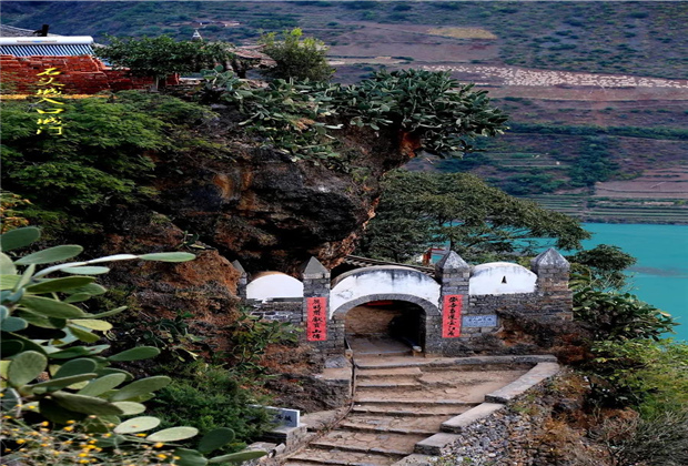 從路邊的山梁上看石頭城,東面是滾滾的金沙江,北方是雄險的太子關(guān),西邊是逶迤的牦牛嶺,南側(cè)是巖石渡絕壁,全然是一個巨大的石頭聳立于金沙江峽谷的陡峭山坡上,勢如刀削,猿猴也難攀爬上來。