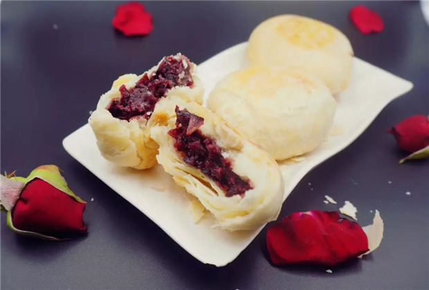 鮮花餅是一種以云南特有的食用玫瑰花入料的酥餅,它也是滇式月餅的經(jīng)典代表之一。鮮花餅入口酥軟,玫瑰香醉人。一口咬下去,那種滿足感油然而生,香甜酥糯,伴隨花香在口腔里擴(kuò)散開來。