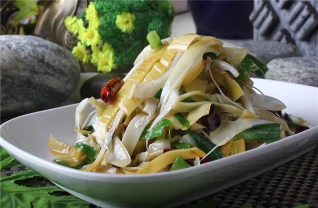 將石榴花剝開花瓣,剔除花蕊,把剩下的部位用清水洗凈,隨后熱水焯燙,撈出濾干,再放入清水中浸泡3—5天就可去除大部分的苦澀味,去苦后的石榴花可與火腿、肉片爆炒,加鹽、加少量水燉炒,具有大理特色風(fēng)味的“小炒石榴花瓣”就完成了。炒熟的石榴花瓣,清爽可口香氣撲鼻,清香中略微帶一點點苦澀,給這道菜增添了更多風(fēng)味。
