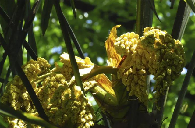 棕包花即棕櫚樹的花苞,狀如魚卵,花色金黃,手掌大小,敦厚如實,長得就不像食物的樣子,在許多地方都能見到,卻很少有人注意它,是很多云南小孩的記憶中嬉戲打鬧的最佳工具。