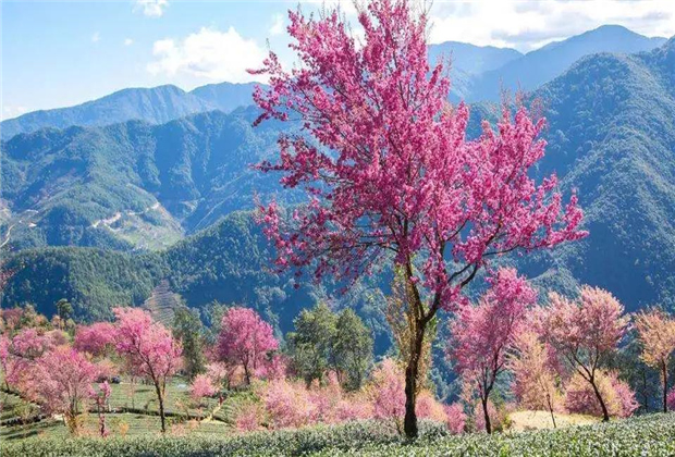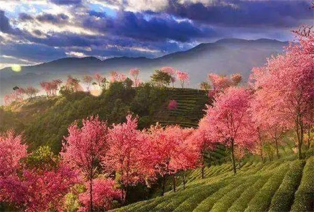 當(dāng)北方在大雪茫茫的冰天雪地時,云南大理南澗無量山的冬櫻花,每年一到12月中旬就如期綻放,綠茶襯著紅櫻,仿若油畫一般,美不勝收。