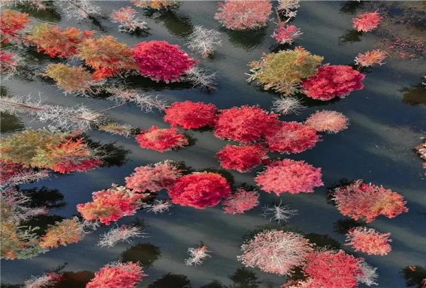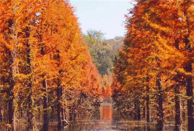蜿蜒曲折勾勒出水邊線(xiàn)條的排排水杉、倒影在藍(lán)色的水面,因?yàn)榍锷境傻幕鸺t樹(shù)葉、筆直挺拔的樹(shù)型,融合在如鏡的水面,宛若仙境的畫(huà)面,好看極了。