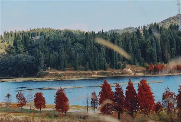 水庫(kù)四周種植了一排排整齊的水杉,隨著季節(jié)的變換不斷更換著它的顏色。