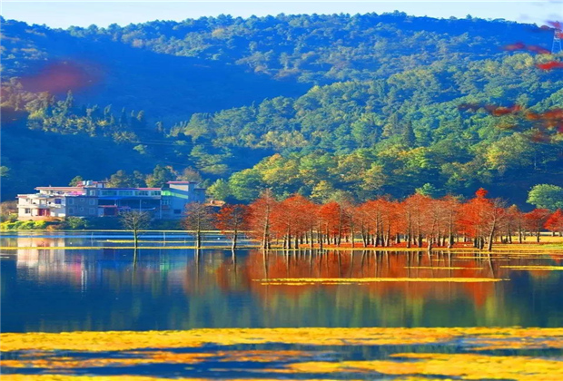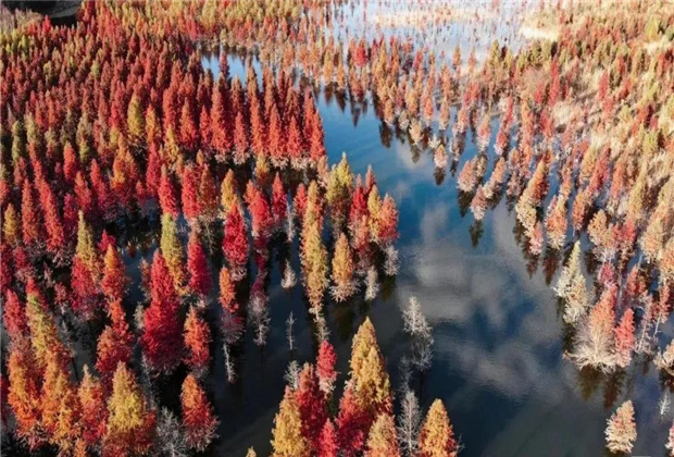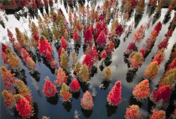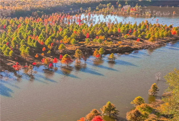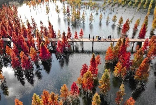 錯(cuò)落有致的水杉倒映湖中,或紅、或黃、或紅中帶黃,絢麗多彩猶如一幅濃墨重彩的油畫(huà)。