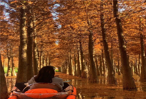 泛舟森林,充滿(mǎn)了詩(shī)情畫(huà)意。夏季水波蕩漾,寂靜清幽,到了秋冬就換上紅妝變了副模樣。