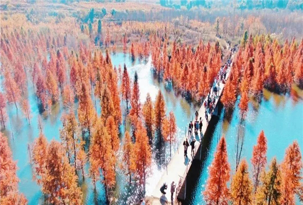 緋紅的水杉宛如綻放的花朵,與藍(lán)色的湖面相映成趣。圍繞在耳邊的只有風(fēng)聲水聲和鳥(niǎo)叫聲,大片的水杉在水邊勾勒出一幅畫(huà)卷
