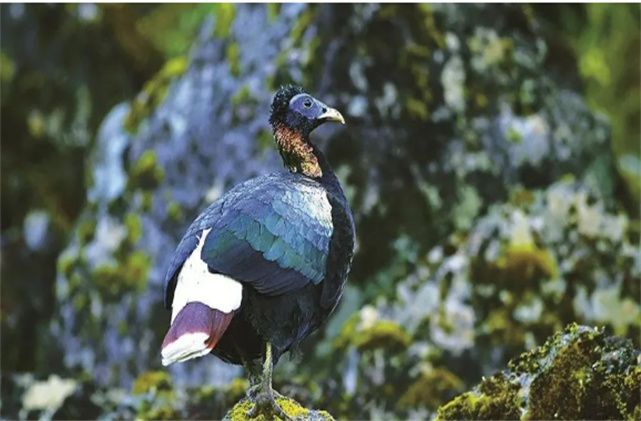 白尾梢虹雉又被稱作“雪鵝”,體長達(dá)58—67厘米,雄性色彩絢麗,上體大都呈金屬藍(lán)綠色,下背依次純白,尾棕色而端部白色,下體純黑。嘴長而稍彎,上嘴較下嘴稍大而覆蓋下嘴。白尾梢虹雉多棲息在海拔2500—3400米的箭竹林、針葉林和草甸等生物環(huán)境中,完全適應(yīng)溫度低、濕度大、云霧多的高山環(huán)境。在中國,白尾梢虹雉僅分布在云南西北部的騰沖、瀘水、西藏東南部丹巴江上游山脈、福貢和貢山一帶,是典型的留鳥。該物種是滇西北部高黎貢山自然保護(hù)區(qū)的主要保護(hù)對(duì)象之一。