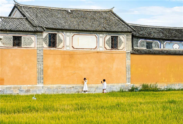 喜林苑位于大理喜洲鎮(zhèn)的東側(cè),周圍是一整片田地。喜林苑灰瓦黃墻的質(zhì)樸,吸引了許多游客前來(lái)拍照打卡。