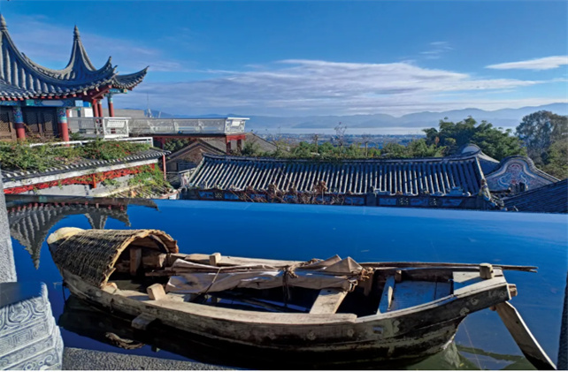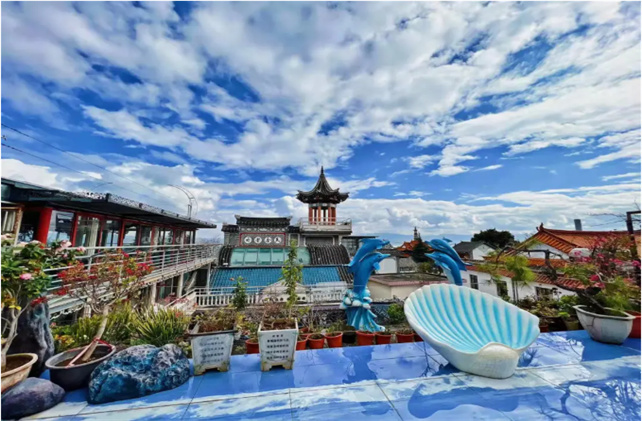 爬上頂樓,視眼頓時開闊,蒼洱風(fēng)光盡收眼底。在一旁的天空之境上,還能看到游客在那里拍照打卡,或者坐在長椅上發(fā)呆,聆聽鳥鳴,享受休閑時光。在屋內(nèi),你還可以參觀大理白族婚房、泥塑展覽,了解白族婚俗文化。