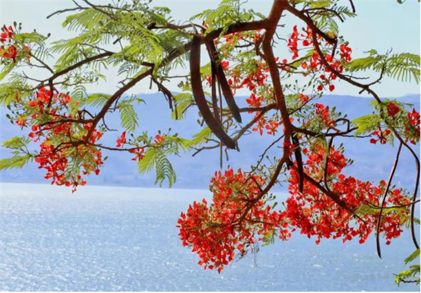 程海,似乎是最近幾年才慢慢被人熟悉。如果一定要有個(gè)根源,我想,那便是西岸火紅的鳳凰花,一到五月就亮麗了盛夏,也熱紅了外來游人的眼。