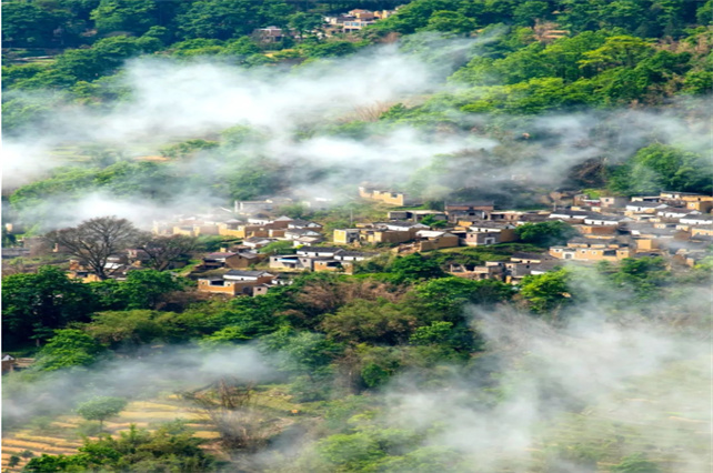 城子古村背靠山巒河流懷抱黃墻灰瓦映襯在青山綠水中