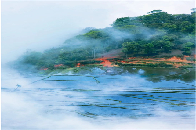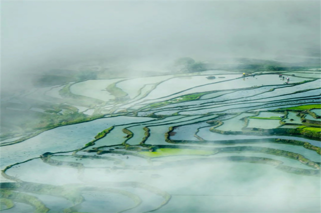 梯田被翠綠掩蓋起來一眼望去翠色欲流清風(fēng)徐來,綠浪滾滾。