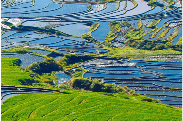 梯田猶如一塊塊明鏡鑲嵌于溝谷之中五彩斑斕,美輪美奐。