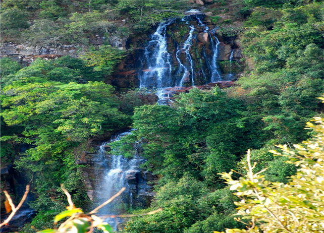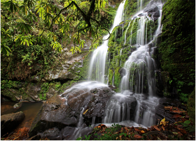 九層瀑布由大圍山原始森林公園內(nèi)眾多的溪流、山泉匯合而成,瀑布共有三疊,每疊三層,共九層,順石隙飛流直下,絕美壯觀。