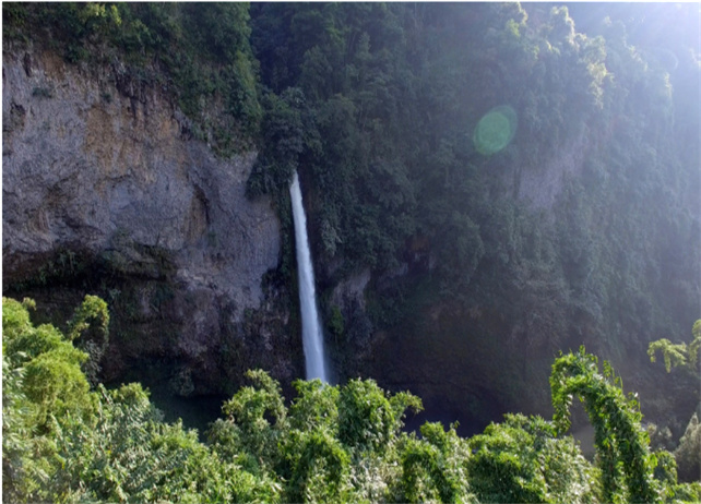 由屏邊縣城出發(fā),沿牧羊河而下,向西北行至7千米處的滴水層,站在326國道上便可見一條懸掛在幾十丈高的絕壁峭巖上的瀑布,這就是滴水層瀑布。