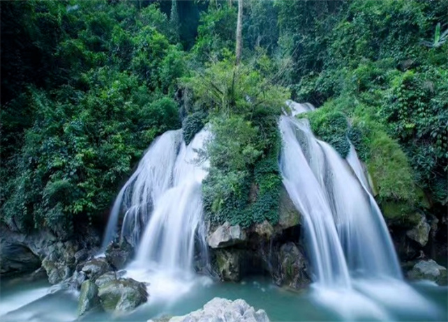 石屏縣昌明九臺瀑布位于龍武鎮(zhèn)昌明村東南方向,深藏在茂密的原始叢林峽谷之中,瀑布最高落差達到40余米,形成各具特色的瀑布群,由于瀑布發(fā)源地與大橋河落差數(shù)百米,河道狹長所以水流終年不息。
