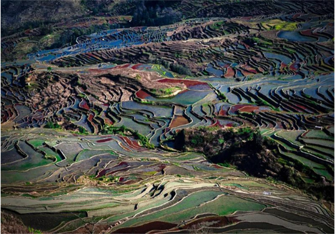一道道田埂像一座座獨(dú)木橋,只有一雙腳并排的寬度,因此只能在同個(gè)方向獨(dú)行前進(jìn),或者選擇原路返回,沒(méi)法兩個(gè)人同時(shí)前進(jìn)。沒(méi)走過(guò)田埂的人,很容易走著走著就掉到田里去。而往往就有那么一些人,喜歡挑戰(zhàn),即便腳下再不穩(wěn),也要搖搖晃晃走完整個(gè)田埂。走田埂確實(shí)是近距離接觸梯田的不二選擇,在春天這個(gè)浪漫的季節(jié)里,怎能錯(cuò)過(guò)梯田美景呢?