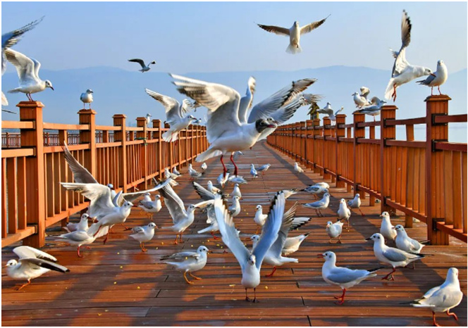 從西伯利亞遠道而來的海鷗停留在異龍湖,市民、游客可以享受投喂的樂趣。海鷗見到游人來,也不害怕,列隊歡迎,為異龍湖增添了一道亮麗的風景線。