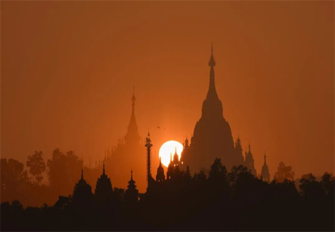 美麗彩霞中雙塔同輝映日
