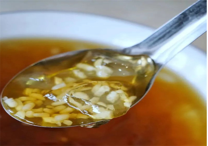 冰稀飯以白糯米為主料,配以小紅棗、西米、芝麻、紅綠絲、紅糖稀、冰渣,突出糯米稀飯的香糯,色澤潔白,點綴色澤鮮艷的果品,紅糖稀的純甜,冰渣的涼爽,一碗下肚,舒服至極。