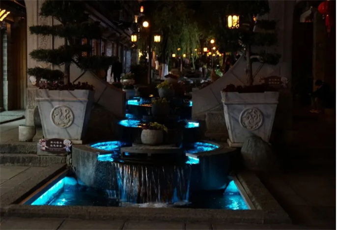 街心的水景被打上藍(lán)盈盈的燈光,仿佛月色之下的小河淌水,淙淙而下,清冷而孤寂,和街上駐場(chǎng)歌手們此起彼伏的搖滾樂聲形成強(qiáng)烈的對(duì)比。但若你仔細(xì)去看,終究還是能發(fā)現(xiàn)街邊游離在歌曲之外的孑然孤影,在歌聲編織的大夢(mèng)中不愿清醒……