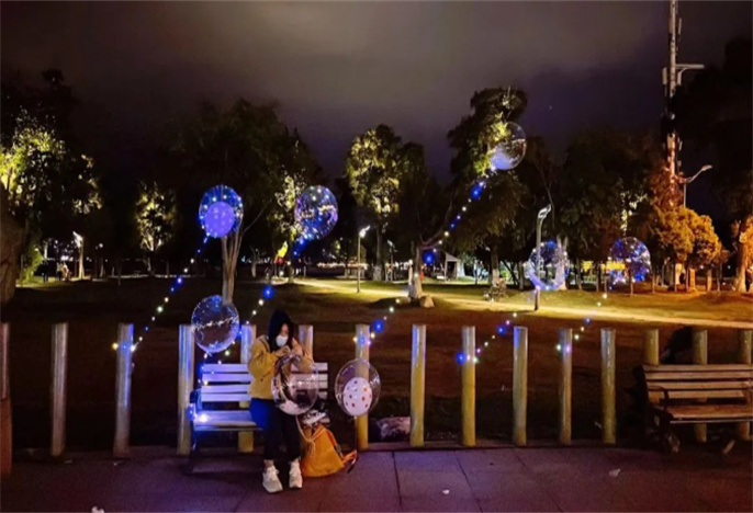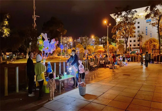 廣場(chǎng)一邊燈光搖曳,自發(fā)形成的夜市在此繁榮,風(fēng)箏、泡泡棒和兒童體驗(yàn)項(xiàng)目占據(jù)了大半江山,炸洋芋、卷粉、蛋糕等美食攤位同樣繁多,還有現(xiàn)在已難得一見的糖畫。值得一提的是,棉花糖和發(fā)光氣球的攤位前,情侶的數(shù)量好像比孩子還多……
