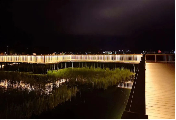 健身中心的廣場(chǎng)緊連著洱海濕地公園,若是白天來,就能看到在蘆葦蕩中穿梭飛舞的鳥兒,晚上則只剩下木頭棧道上昏黃的裝飾燈成為唯一的光源,四周黑暗而寂靜,偶爾傳來幾聲難辨物種卻格外清晰的鳴叫,告知這里的夜晚并不寂寞。
