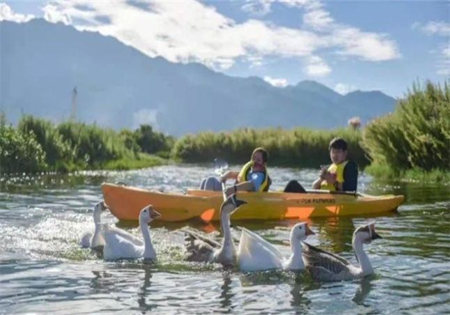 水花莊園除了鮮花,還可以有皮劃艇體驗(yàn),沿著彎彎曲曲的湖水泛舟,不失為一個(gè)夏日