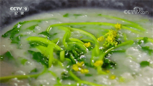 再加入鮮嫩的小油菜  不停攪拌烹煮  放上油菜花點(diǎn)綴  像極了凝固的春景圖畫
