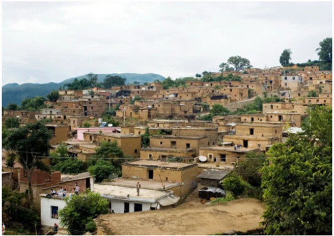 古村背山面水,屹立于飛鳳山上,山前碧水環(huán)繞,綠野鋪陳,土黃色的建筑物,在陽(yáng)光下發(fā)出金色的光芒。