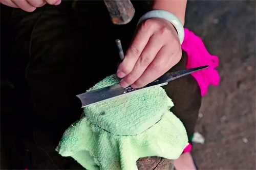 戶撒刀的制作工藝包括下料、制坯、打烊、修磨、飾葉、淬火、拋光、做柄、制帶、組裝等 10 道工序,細(xì)分的話有上百道工序。許喃元的父親最拿手的絕活就是精加工當(dāng)中的走銅工藝。當(dāng)時掌握這項工藝的工匠鳳毛麟角。走銅工藝是給刀身的鏨刻花紋渡上一層金色,在成型的刀上均勻的涂上黃銅粉末,然后拿到松碳上烤,可以讓刀看起來更絢麗。這項技術(shù)考驗的是銅的配方以及烤時溫度的把控,溫度掌控好了,刀的受熱均勻了,走出來的銅才夠華麗。在戶撒鄉(xiāng),會雙面走銅工藝的人很少。但是,戶撒刀的技藝一般都是傳男不傳女的,年輕的她卻認(rèn)為現(xiàn)在是新時代了,要勇于打破舊觀念。作為女性,雖然力量懸殊沒有直接參與捶打的這項工藝過程,但她認(rèn)為研磨、拋光、還有父親的走銅技藝自己是完全可以掌握的。于是,她決定學(xué)習(xí)父親的這項技藝,經(jīng)過死磨硬泡,父親終于拗不過倔強(qiáng)的她,便把配方及技藝精髓教授給了她。