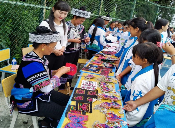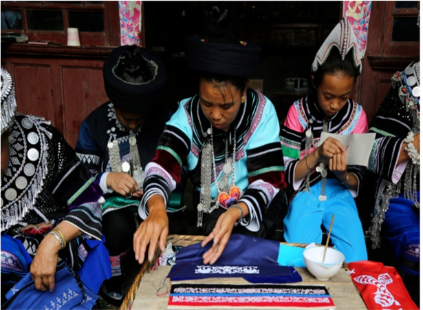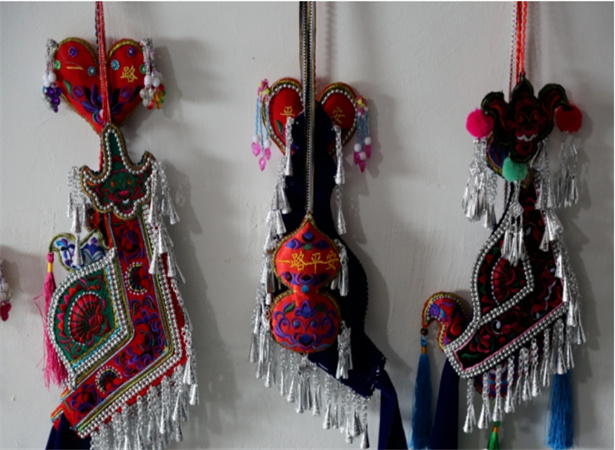 紅河彝族刺繡為全手工制作而成,繡品注重整體關系,圖案構思奇特,寓意吉祥。以日月星辰、云彩、波浪、彩虹、飛禽走獸、花鳥魚蟲等為紋案作出剪紙并按照一定的構圖關系粘貼于特別的布料上,再選取黑、藍、紅、黃、綠、青、紫等不同顏色的絲線以“平繡”繡法為基調(diào)進行創(chuàng)作。